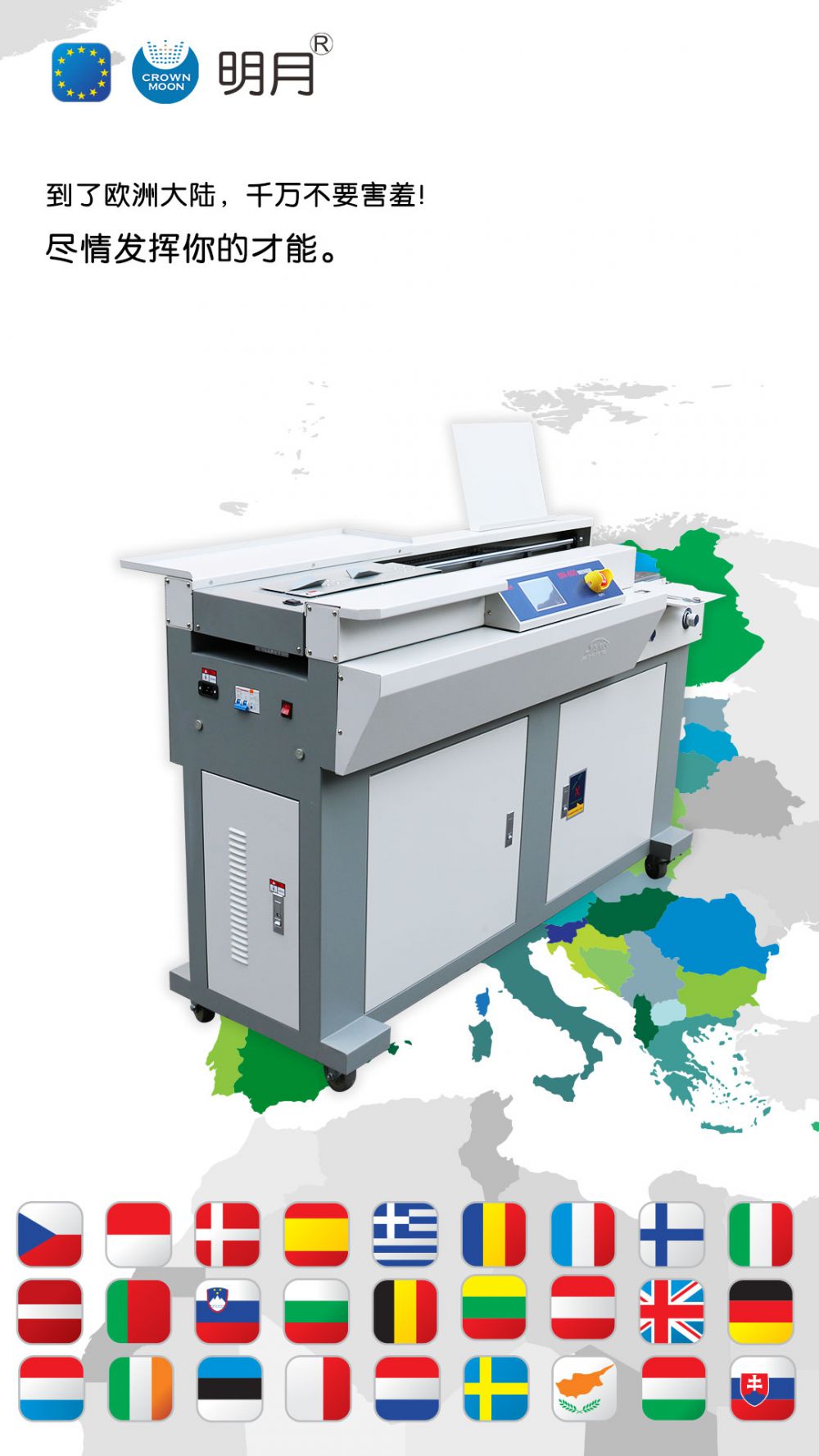 此次通過CE認證的明月膠裝機系列產品,在智能無線膠裝技術及用戶體驗上,實現采用了多重“保障”屏障,從研發到選材到生產制造等方面,在用戶身邊構建一道道保護,以智能、安全、高效、環保、節能等優勢深受客戶喜愛,產品遠銷歐美、東亞、東南亞、中東等四十多個國家和地區。
